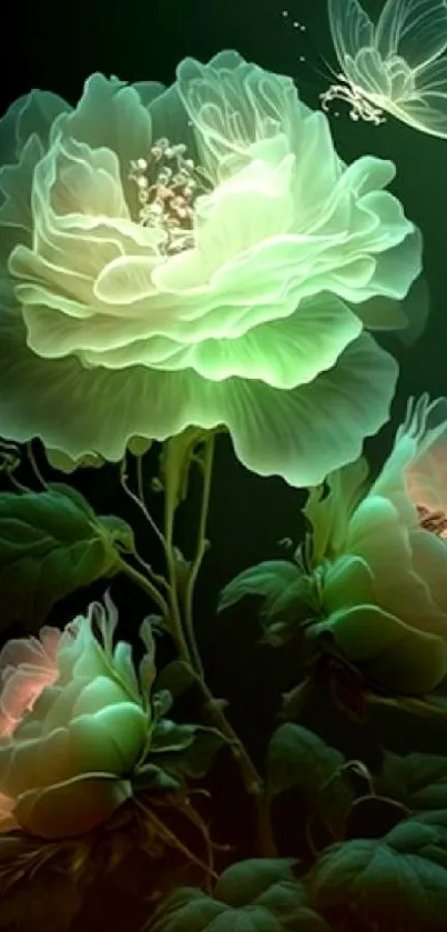 Download an elegant floral mobile wallpaper featuring luminous flowers and a delicate butterfly, perfect for adding a touch of nature to your smartphone