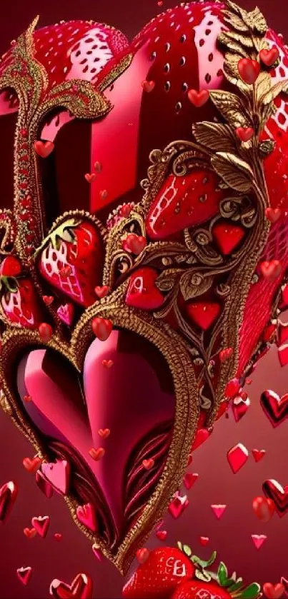 Download this luxurious heart-shaped strawberry mobile wallpaper featuring intricate gold detailing for a touch of romance and elegance. Perfect for those who appreciate art and beauty on their screens, this design highlights the vibrant red tones and ornate decorations