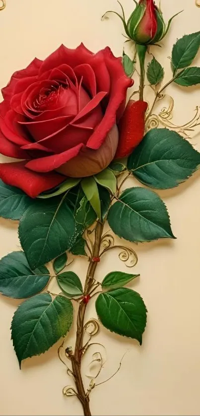 Download this elegant red rose wallpaper featuring a beautifully detailed bloom and rich green leaves on a soft background, perfect for adding a touch of nature to your mobile screen