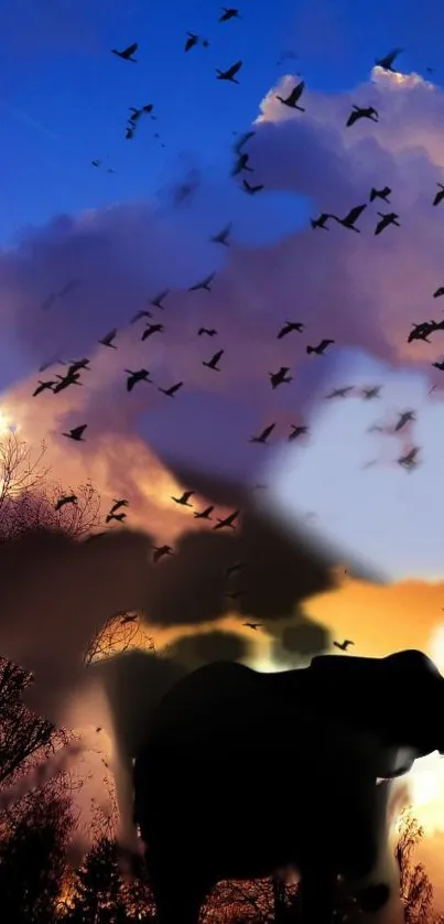 Experience the beauty of nature with this stunning silhouette wallpaper featuring an elephant against a vibrant sunset sky, adorned with birds and dramatic clouds. Ideal for fans of wildlife and scenic art, this mobile wallpaper brings a serene yet spectacular touch to your screen
