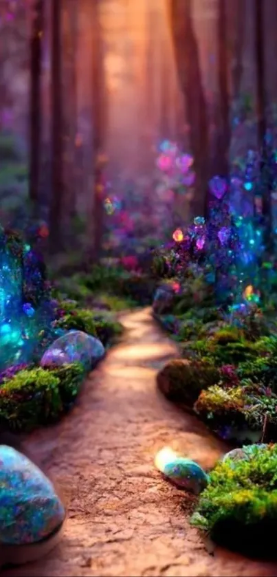 Immerse yourself in this stunning mobile wallpaper depicting an enchanted forest with glowing stones along a mystical pathway, perfect for nature lovers and fantasy enthusiasts seeking a magical ambiance