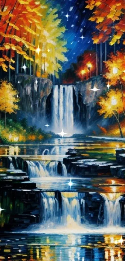Experience a mesmerizing autumn waterfall scene with vibrant colors and sparkling reflections, perfect for enhancing your mobile wallpaper collection