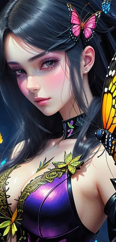 Explore this enchanting mobile phone wallpaper featuring a mystical fantasy art design with vibrant butterflies surrounding a dark-haired beauty adorned in purple and floral accents. Perfect for fantasy art enthusiasts and nature lovers seeking unique digital decor