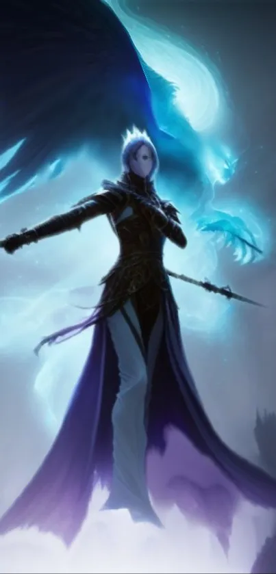 Explore a stunning fantasy wallpaper featuring an ethereal warrior with a mystical aura, accentuated by vibrant hues of blue and purple. Perfect for mobile displays, this captivating artwork brings a touch of magic and mystery to your screen