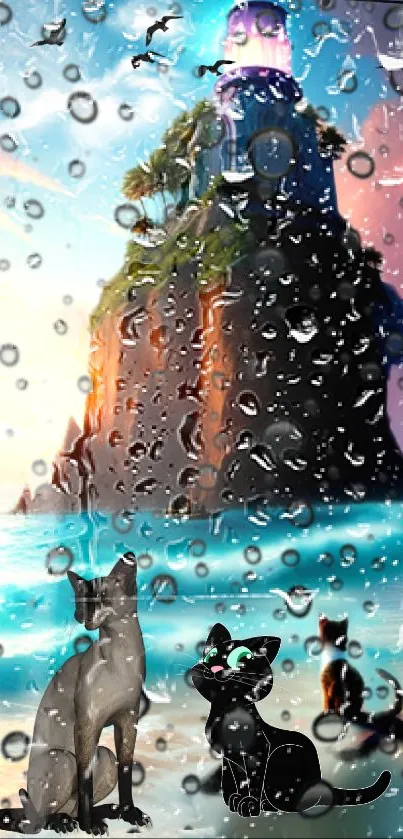 Immerse in this enchanting mobile wallpaper featuring a magical lighthouse by the sea, blending vibrant colors and serene nature, ideal for ocean and cat lovers alike