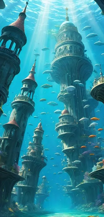 Discover the enchanting underwater cityscape in this vibrant mobile wallpaper, featuring majestic towers and colorful fish swimming through tranquil, sunlit waters
