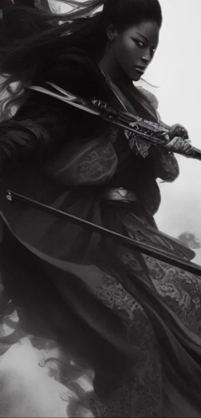 Discover the captivating monochrome mobile wallpaper featuring a fierce female warrior poised for action, wielding two swords with an intense gaze. Perfect for those seeking a powerful and dramatic home screen expression