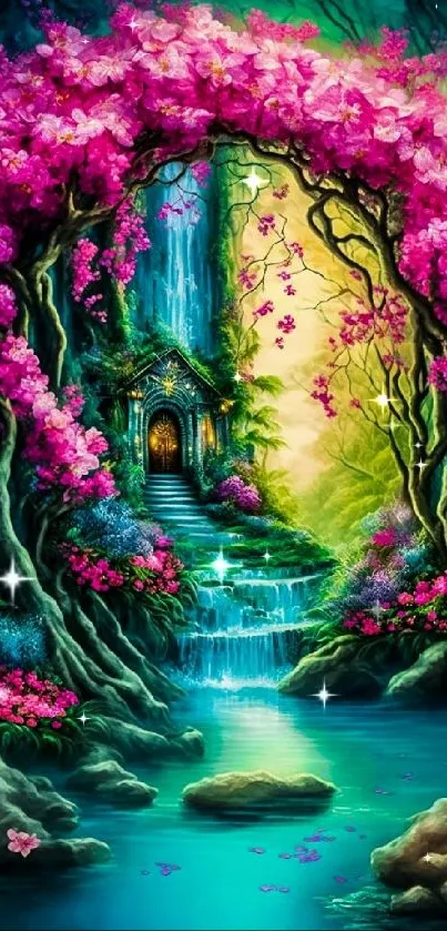 Immerse in a vibrant world of fantasy with this stunning mobile wallpaper featuring enchanting cherry blossoms, a serene waterfall, and a mystical house, perfect for nature and art enthusiasts