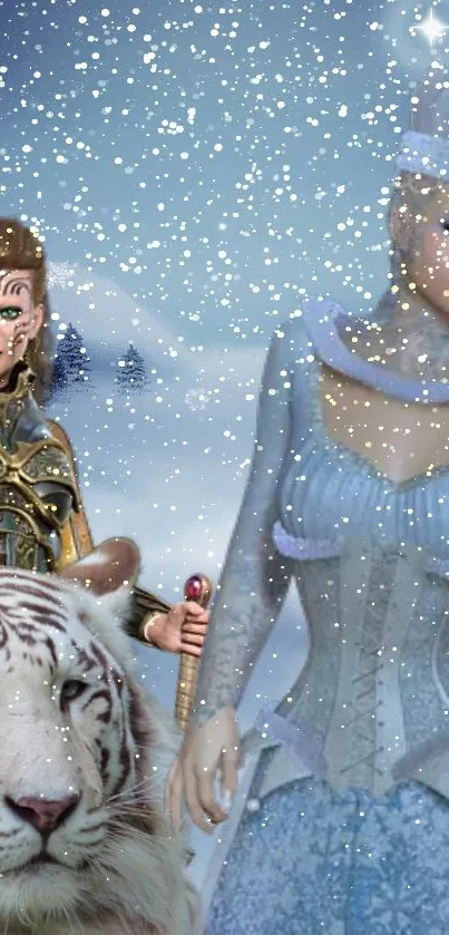 Immerse in a fantasy realm with this enchanting wallpaper featuring a Snow Queen, a fierce warrior, and a majestic white tiger amidst a magical snowy landscape. Perfect for those who love mythical, fantasy, and winter themes on their mobile devices