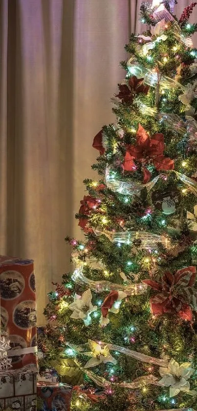 Capture the festive magic with this vibrant mobile wallpaper featuring a beautifully lit Christmas tree surrounded by presents, creating a warm and joyful holiday ambiance