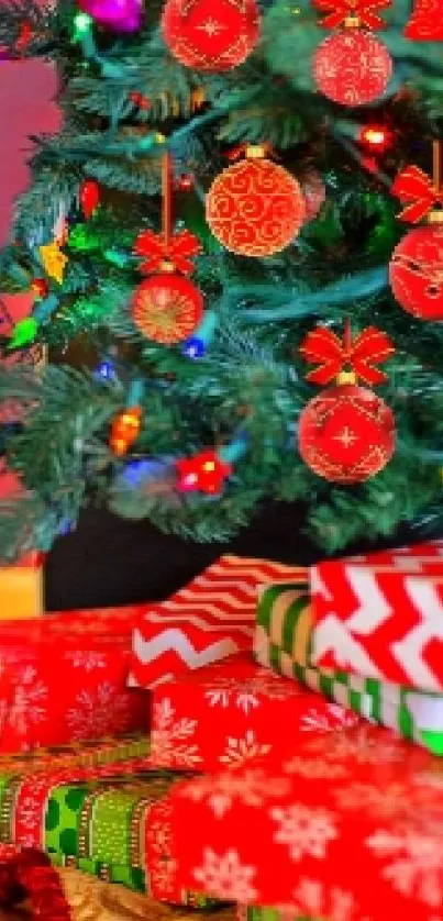 Brighten your phone with a festive Christmas tree adorned with vibrant decorations and colorful gifts, perfect for holiday spirit