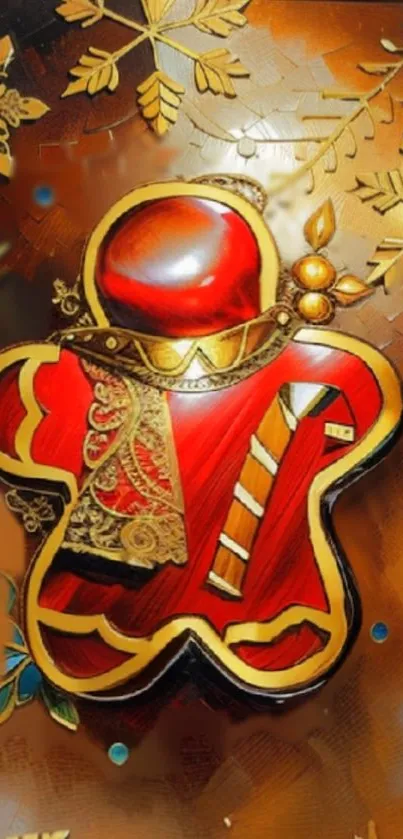 Download this festive mobile wallpaper featuring a gingerbread figure adorned with intricate golden patterns and vibrant holiday decorations, perfect for adding a touch of holiday spirit