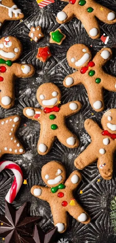 Enjoy a festive mobile phone wallpaper featuring gingerbread cookies, candy canes, and star shapes, perfect for holiday cheer. A delightful combination of baking and Christmas themes brings warmth and joy to your screen, making it ideal for fans of seasonal decorations and sweets