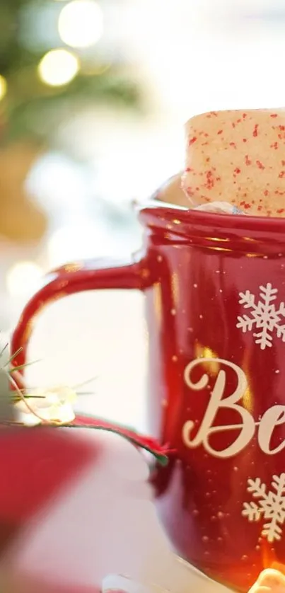 Capture the warmth of the holiday season with this festive red mug mobile wallpaper, featuring a snowflake design and bokeh Christmas tree lights, perfect for spreading cheer