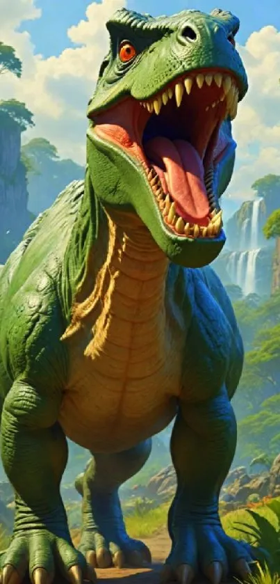 Download an epic dinosaur jungle wallpaper featuring a roaring T-Rex in a vibrant prehistoric landscape, perfect for your mobile device. This wallpaper captures the essence of ancient wilderness with lush greenery and cascading waterfalls, bringing a touch of adventure to your screen