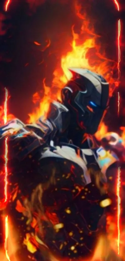 Explore the intense and vivid imagery of a futuristic robotic warrior engulfed in fiery flames, perfect for dynamic mobile backgrounds. Enhance your screen with this captivating, high-energy design featuring vibrant colors and striking contrasts