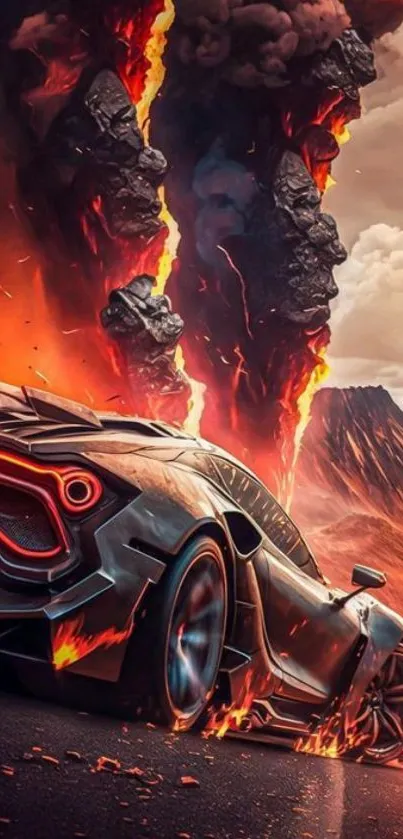 Download this stunning fiery sports car wallpaper, featuring a sleek design amidst erupting volcanic flames, perfect for automotive and adventure enthusiasts