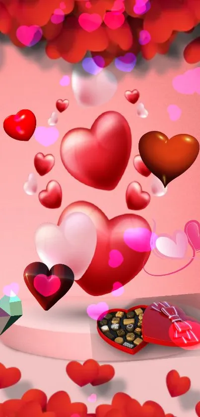 Download a charming pink and red heart-themed mobile wallpaper featuring floating 3D hearts, perfect for expressing love and affection on your device