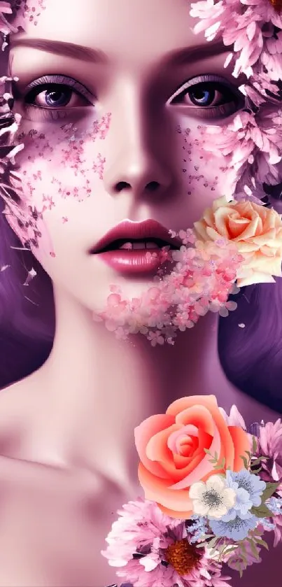 Enhance your screen with this enchanting mobile wallpaper featuring a mystical face adorned with vibrant pink and purple flowers, perfect for floral art lovers