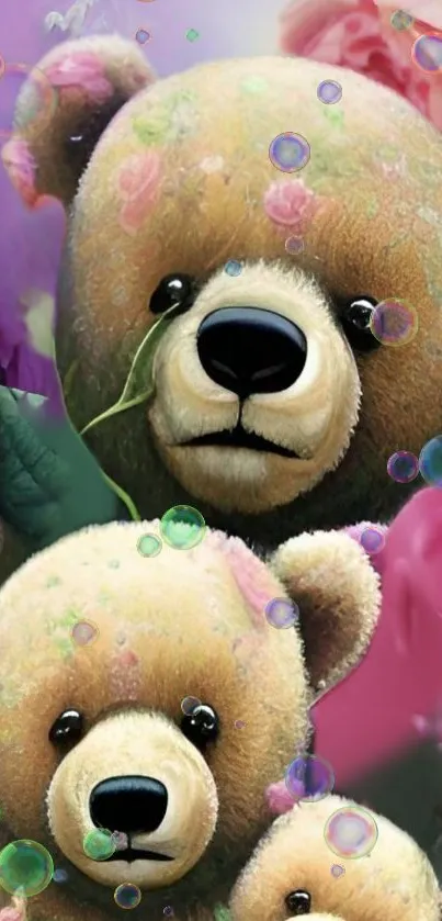 This charming mobile wallpaper features a pair of adorable teddy bears amidst vibrant pink flowers and playful bubbles, creating a whimsical and cute display perfect for adding a touch of joy and warmth to your screen. Ideal for bear lovers and enthusiasts of playful designs