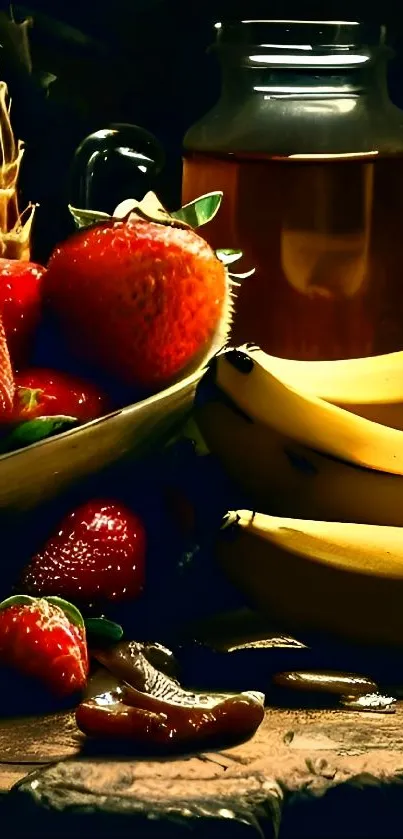 Enhance your mobile with a vibrant still life wallpaper featuring fresh bananas and strawberries, ideal for a refreshing visual appeal
