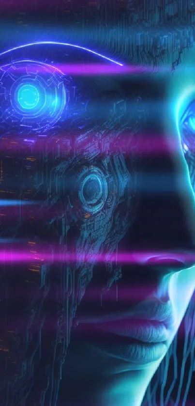 Download this captivating futuristic AI face wallpaper, featuring neon blue lights and intricate technological patterns, perfect for tech enthusiasts and sci-fi fans