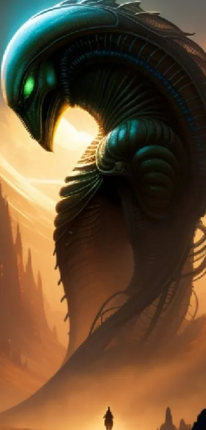 Explore this stunning futuristic alien landscape wallpaper. The giant alien entity looms over a mysterious, otherworldly terrain, blending intricate details and surreal lighting, perfect for science fiction enthusiasts and digital art lovers. Enhance your device with this unique imagery
