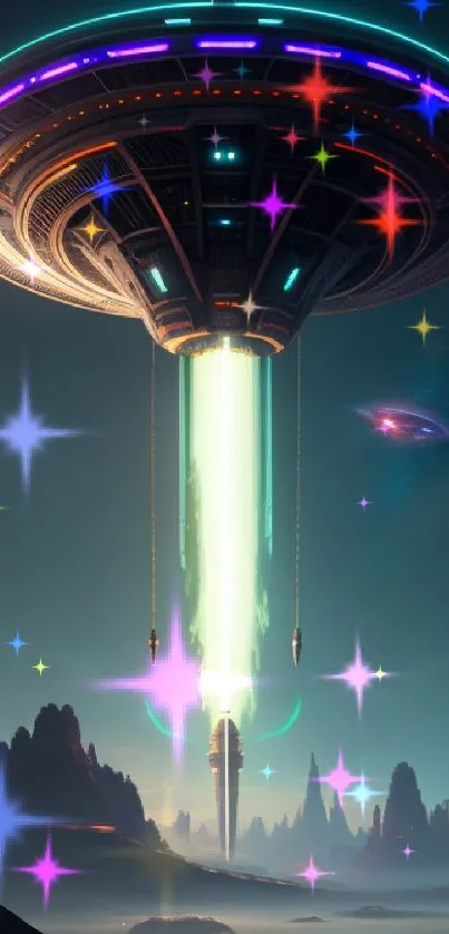 Experience a cosmic journey with this vibrant mobile wallpaper featuring a futuristic alien spaceship emitting a powerful beam, set against a mysterious extraterrestrial landscape. Perfect for sci-fi enthusiasts seeking adventure in the unknown