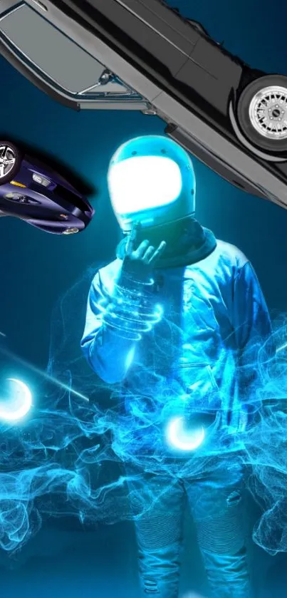 Explore the cosmic allure with this futuristic astronaut-themed mobile wallpaper, featuring a vibrant blue aura amidst sleek cars and ethereal smoke