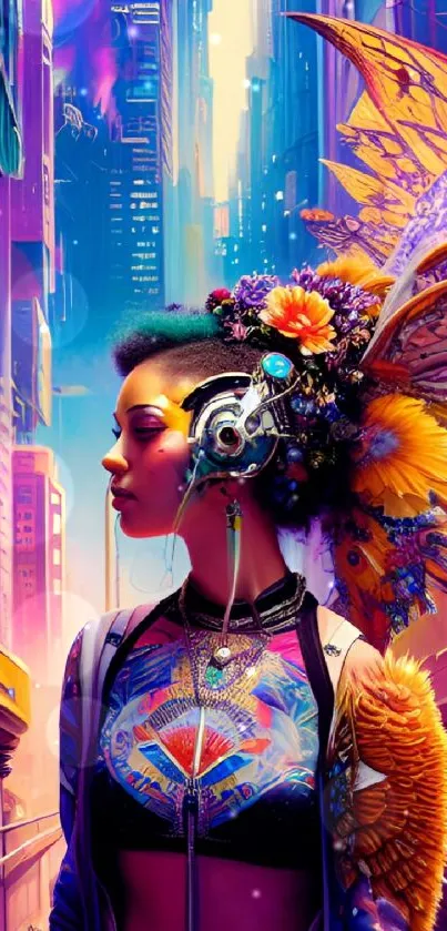 Explore a vivid fusion of futuristic and fantasy elements with this vibrant mobile wallpaper featuring a butterfly-adorned character in a neon cityscape. Perfect for lovers of imaginative and colorful art that transcends reality
