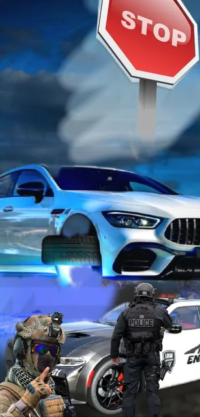 Explore a dynamic wallpaper featuring futuristic cars with glowing wheels beneath a stop sign, set against a dramatic sky