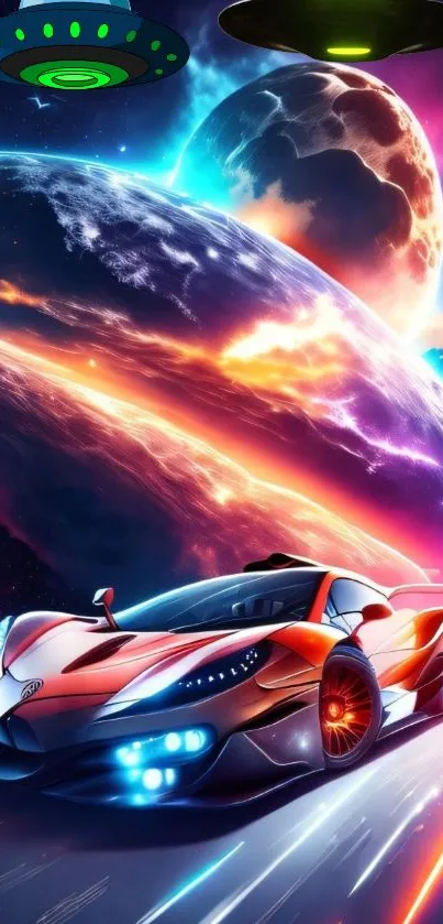 Experience the thrill of speed in a futuristic cosmic car racing through vibrant planets and stars, perfect for your mobile wallpaper. This digital art piece combines a high-speed vehicle with a colorful universe backdrop, bringing a sense of adventure and excitement to your screen