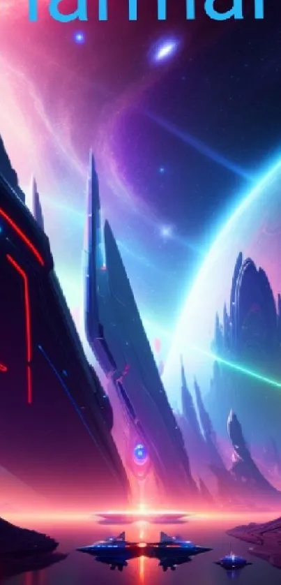 Explore a captivating futuristic cosmic landscape wallpaper featuring vibrant colors and glowing elements, perfect for a dynamic mobile background