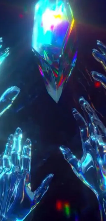 Explore a captivating futuristic scene featuring crystalline robotic hands against a dark backdrop, perfect for tech enthusiasts seeking unique smartphone wallpapers