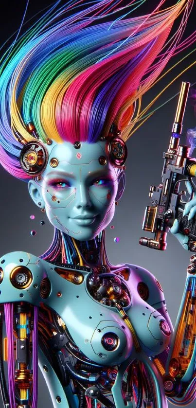 Discover a stunning cyberpunk robot with vibrant colors, futuristic design, and artistic flair, perfect for enhancing any mobile screen