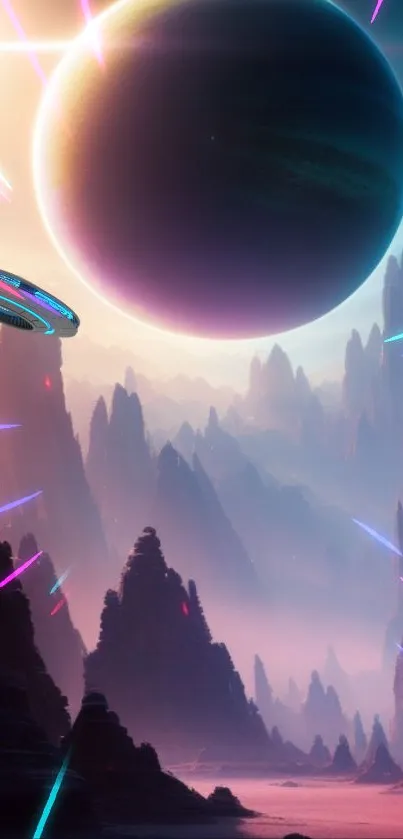 Explore a stunning futuristic landscape with this sci-fi wallpaper featuring a distant planet, colorful lights, and intriguing mountain silhouettes. Perfect for technology and space enthusiasts seeking a vibrant mobile background