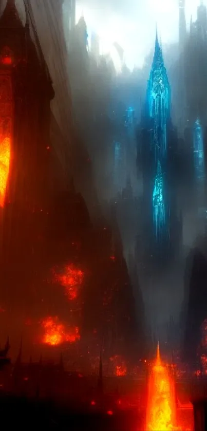 Immerse in a futuristic cityscape wallpaper featuring vibrant neon blue and fiery orange hues, creating a mesmerizing blend of light and shadow that brings a dynamic, otherworldly atmosphere to your mobile screen