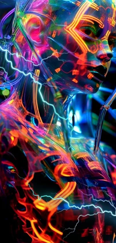 Immerse your phone in a vibrant cyberpunk universe with this futuristic neon wallpaper featuring a detailed robotic figure and vivid colors
