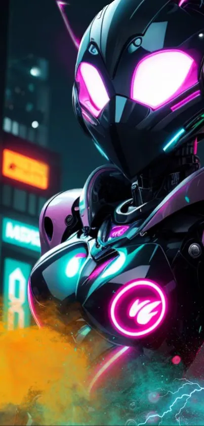 Explore a vibrant, cybernetic world with this futuristic neon robot wallpaper, perfect for tech enthusiasts seeking a dynamic phone screen upgrade