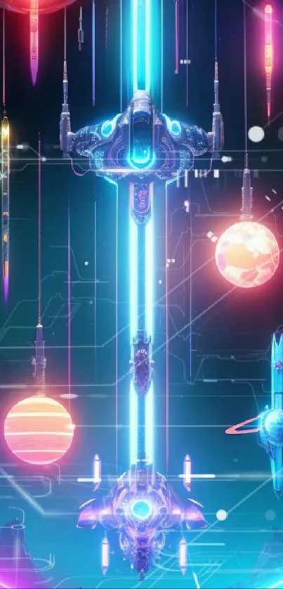 Download this stunning futuristic neon space art wallpaper, featuring vibrant colors, spaceships, and distant planets, perfect for technology enthusiasts looking to enhance their mobile background with a touch of sci-fi art