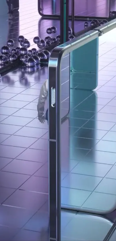 Explore a futuristic ambiance with this reflective mobile phone wallpaper, featuring sleek metallic surfaces and scattered spheres