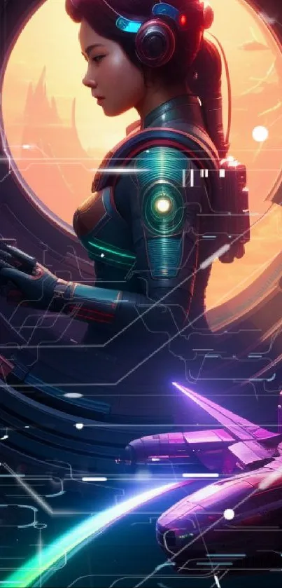 Explore a futuristic universe with this sci-fi themed mobile wallpaper featuring a female astronaut gazing into space, complemented by vibrant spaceship details and neon highlights, perfect for technology and fantasy lovers