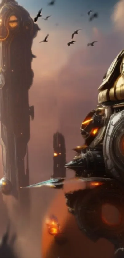Explore a stunning futuristic cityscape wallpaper featuring intricate sci-fi architecture and vibrant sunset hues, perfect for elevating your mobile phone screen