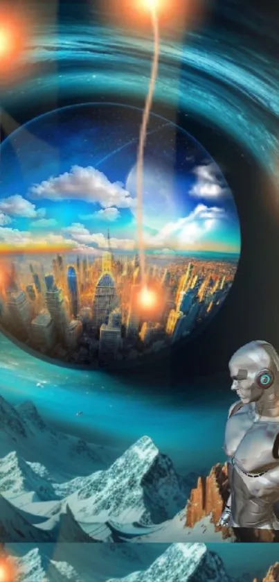 Explore a mesmerizing sci-fi cityscape in this futuristic wallpaper, featuring a robot amidst a surreal mountainous landscape with glowing portals, combining technology and nature in a digital dream