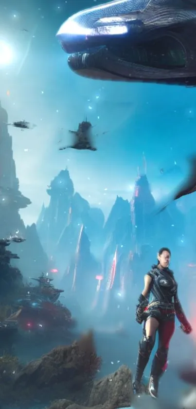 Explore a futuristic world with this sci-fi mobile wallpaper featuring stunning landscapes, advanced spacecraft, and a heroic figure. Perfect for fans of science fiction and immersive visuals