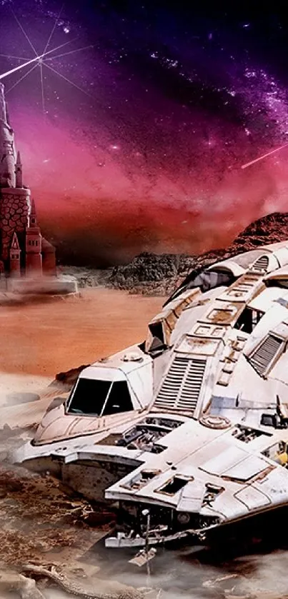 Explore a futuristic landscape with a grounded spaceship and distant alien cityscape engulfed in a cosmic atmosphere on this stunning mobile wallpaper