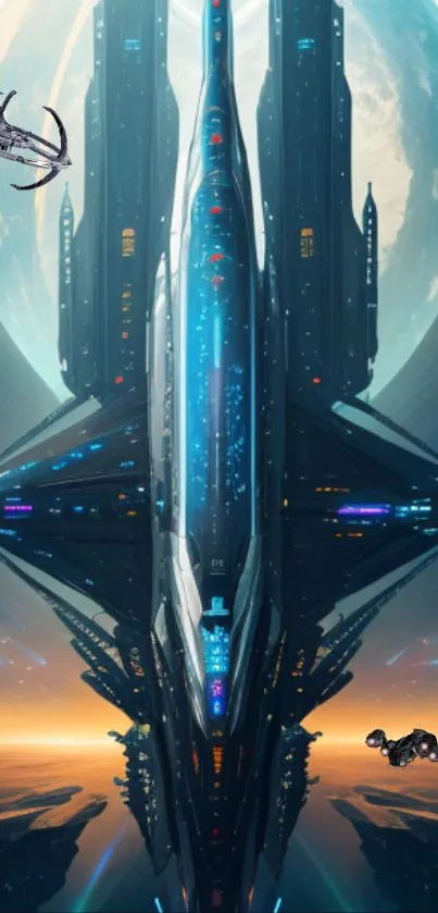 Explore a mesmerizing futuristic spaceship flying through a galaxy backdrop with glowing lights and sleek design, perfect for sci-fi fans and tech enthusiasts seeking a dynamic mobile wallpaper