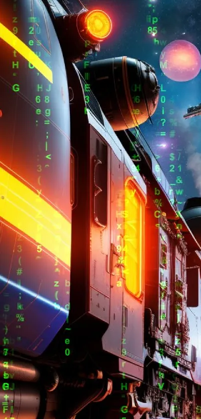 Explore a futuristic train journey through space with this cosmic mobile wallpaper, showcasing a sleek train against a starry sky with planets and spaceships