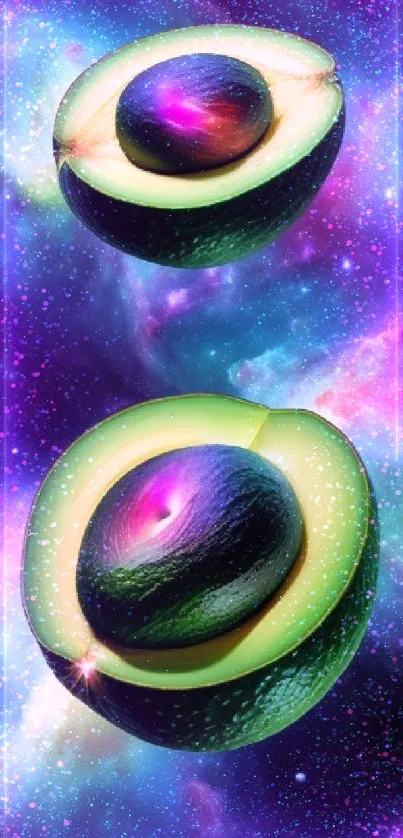 Explore a vibrant and surreal galaxy-themed wallpaper featuring floating avocados amidst a colorful cosmic backdrop. Perfect for adding a quirky and artistic touch to your phone display. Keywords: avocado, galaxy, surreal, art