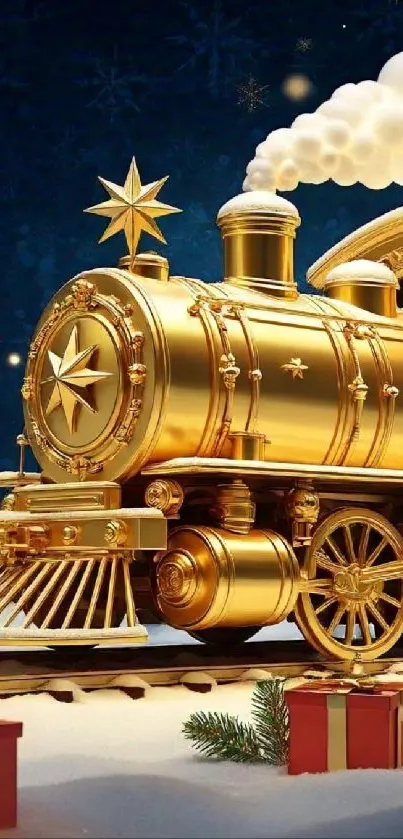 This festive mobile wallpaper features a stunning golden train amid a snowy holiday scene, ideal for the Christmas season